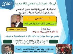بدعوة كريمة من الاخ الصديق د- عبدالله اشملي يسعدني مشاركته باللقاء الثقافي الذي تنظمه الثانوية التأهيلية خديجة أم المؤمنين  تحت إشراف المديرية إلإقليمية  – سيدي البرنوسي بمناسبة اليوم العالمي للغة العربية
