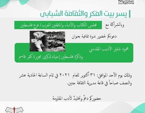 دعوة لحضور ندوة ثقافية بعنوان وذاكرة فلسطين إحياء لذكرى مجزرة كفر قاسم ..الأديب المقدسي محمود شقير الجمعة 29 أكتوبر 2021 شارك يسر بيت الفكر والثقافة الشبابي وبالشراكة مع مجلس الكتاب والأدباء والمثقفين العرب دعوتكم لحضور ندوة ثقافية محمود شقير الأديب المقدسي يقرأه الاخرون أبحث عن وجع يكفيني …نثرية بقلم فريدة توفيق الجوهري 12 أكتوبر 2021 فلتشهر سيفك… بقلم د.وصفي تيلخ 3 مايو 2025 بعنوان وذاكرة فلسطين إحياء لذكرى مجزرة كفر قاسم وذلك يوم الأحد الموافق : 31 أكتوبر للعام 2021 في تمام الساعة الحادية عشر والنصف صباحاً في قاعة مديرة الثقافة جنين حضوركم دعّم وتخليدٌ لأدب المقاومة شارك