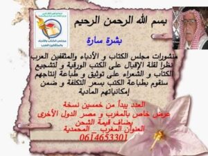لذا قمنا بتاسيس دار نشر ومطبعة خاصة بمجلس الكتاب والادباء والمثقفين العرب لتسهيل الامر على الكتاب والشعراء لطباعة كتبهم ودواوينهم باقل تكلفة وبكميات تبداء من 50 نسخة ليتاح للجميع توثيق كتبهم ضمن امكانياتهم المادية وبحال توفر تصميم الغلاف وال PDF يمكن للكاتب توثيق مؤلفة بالعدد الذي لايريد شريطة الا يقل عن 30 نسخة